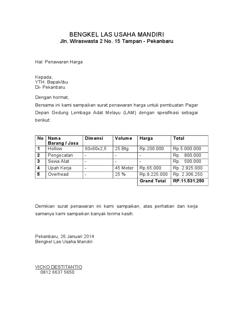 Contoh Surat Penawaran Harga Bengkel Las Contoh Surat from i2.wp.com Sebuah surat penawaran barang dibuat dalam bentuk surat formal yang di dalamnya tertera dengan jelas penjelasan mengenai barang atau jasa yang sedang ditawarkan beserta rincian harganya. Surat penawaran barang /produk dan harga. Contoh surat penawaran merupakan salah satu dari surat resmi yang sangat penting bagi seorang pengusaha, pedagang, jasa dan barang. Berdasarkan contoh surat penawaran harga tersebut, ada beberapa komponen yang perlu ada, antara lain pada surat penawaran harga, informasi mengenai produk yang ditawarkan wajib ada. Karakteristik utama dari surat penawaran berisi tentang harga dan penjualan. Bagi para pelaku usaha bengkel las tentunya pada saat menghadapi klien yang sifatnya formal tidak lepas dari urusan administrasi surat menyurat. Jenis pertama yaitu surat penawaran harga. Anda bisa melampirkan dokumen berisi harga maupun katalog bersamaan dengan surat.